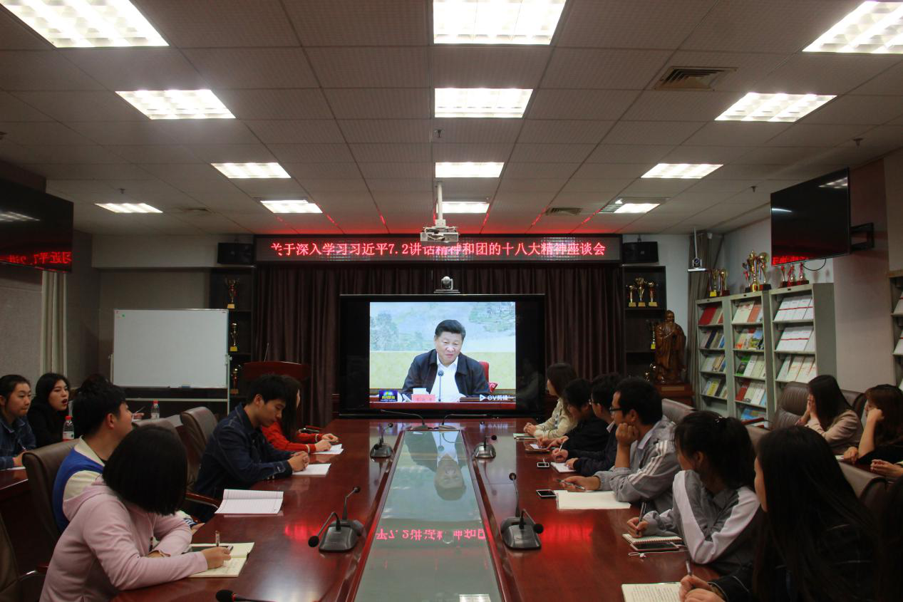 座谈会上,同学们共同观看了团的十八大和习近平7.2讲话新闻视频,会议指出,要以习近平新时代中国特色社会主义思想为统领,必须坚持政治建团,全团要牢牢坚守政治属性、着力突出政治建设、大力强化政治功能,始终把稳共青团事业发展前进的“压舱石”。随后,团委副书记董晓宇详实讲解了团章的修订内容,她指出,我们要认真学习习近平总书记重要讲话精神,毫不动摇地坚持党的领导,在思想上政治上行动上始终同党中央保持高度一致,自觉维护党中央权威,同时要发挥好共青团联系党与青年的纽带作用,全团要不忘初心跟党走,奋发进取,担负起党赋予的神圣使命。会议过程中,同学们深入学习,做到学深悟透,深刻领会党中央关于深入推进共青团改革的重要指示。
