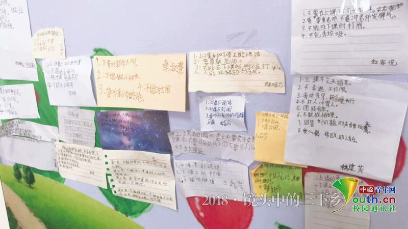 见面之前,孩子们为了表达对实践队员们的期待,在墙上写下自我要求和学习目标。中国青年网通讯员 王星普 摄