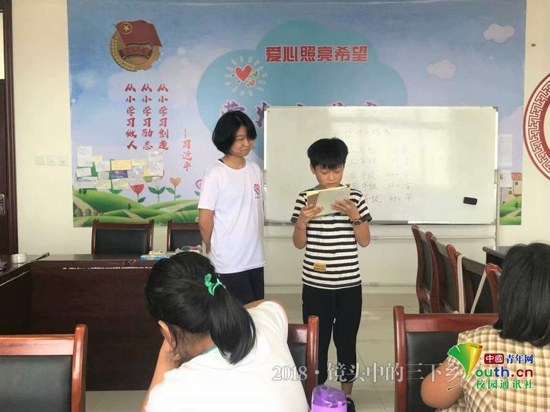 在诗词鉴赏课上,孩子们和实践队员一起朗读《沁园春·雪》,孩子们声情并茂,十分配合。在朗读的同时,老师逐一纠正孩子们的发音,向孩子们讲述祖国的壮丽山河。图为实践队员在朗读诗词中国青年网通讯员 金志超 摄