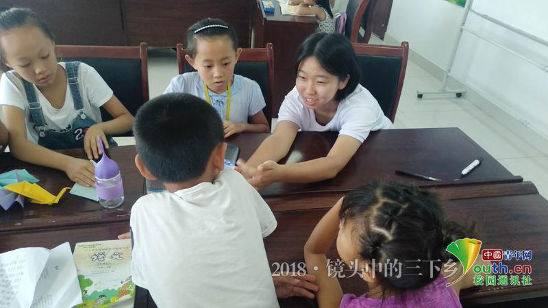 课件休息时间,孩子们主动和实践队员玩游戏,聊天,告诉实践队员自己的“小秘密”。孩子们的快乐也感染了实践队员,实践队员们也和孩子们交流着自己知道的趣事,课间时间虽短,但意义不减。图为课间实践队员和孩子们一起聊天。中国青年网通讯员 王星普 摄