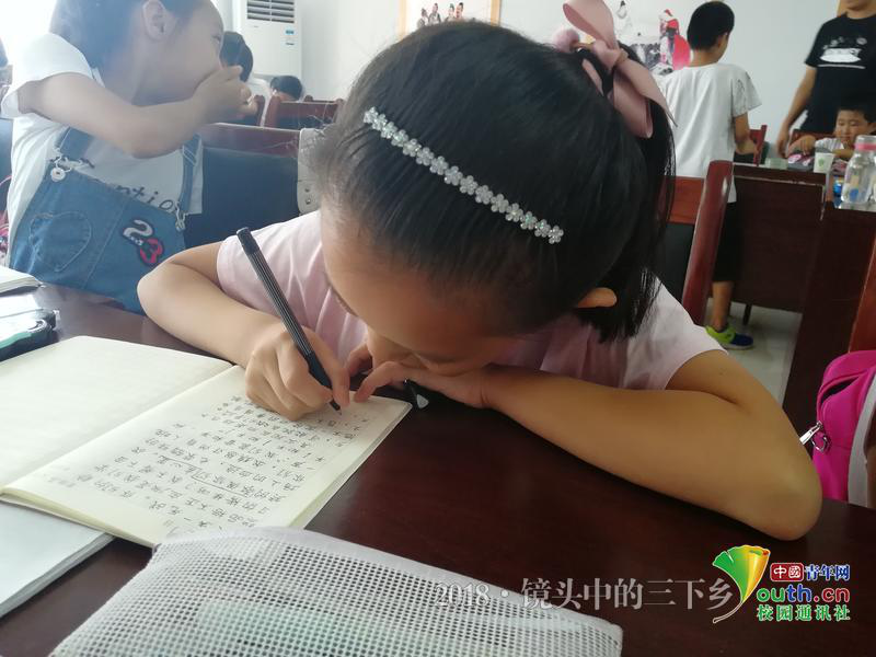 故事课后,实践队员要求孩子们结合刚刚听到的故事,以“我想对英雄说”写一篇作文。之前一遇到生字就罢工的孩子们拿起笔,第一次认认真真的主动开始写作文。他们的作文里有错别字也有拼音,但他们坚持在写,表达自己对英雄们的感谢和尊敬。图为孩子们在一笔一划的写作文。中国青年网通讯员 魏潇阳 摄