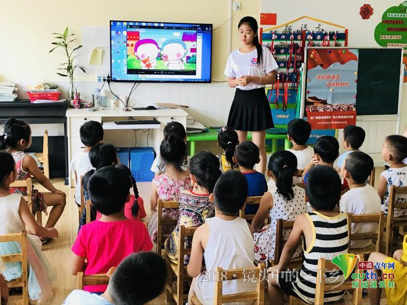 “鹅鹅鹅,曲项向天歌,白毛浮绿水,红掌拨清波。”整齐的背诵声从屋里传来,实践队员走进中班教室和小朋友们初次见面。为了不打扰孩子们背诵,实践队员绕到教室后面,仔细聆听孩子们背诵。“小朋友们背的很齐,这时候他们的发音尚未定型,现在教他们学普通话很是时候。”一位队员说道。