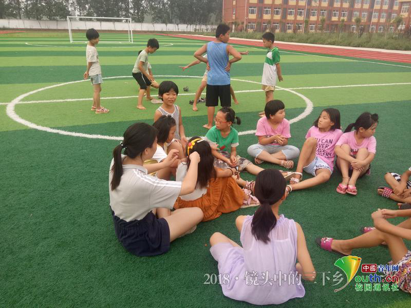图为支教队员为女孩编发。中国青年网通讯员孙淑俊提供