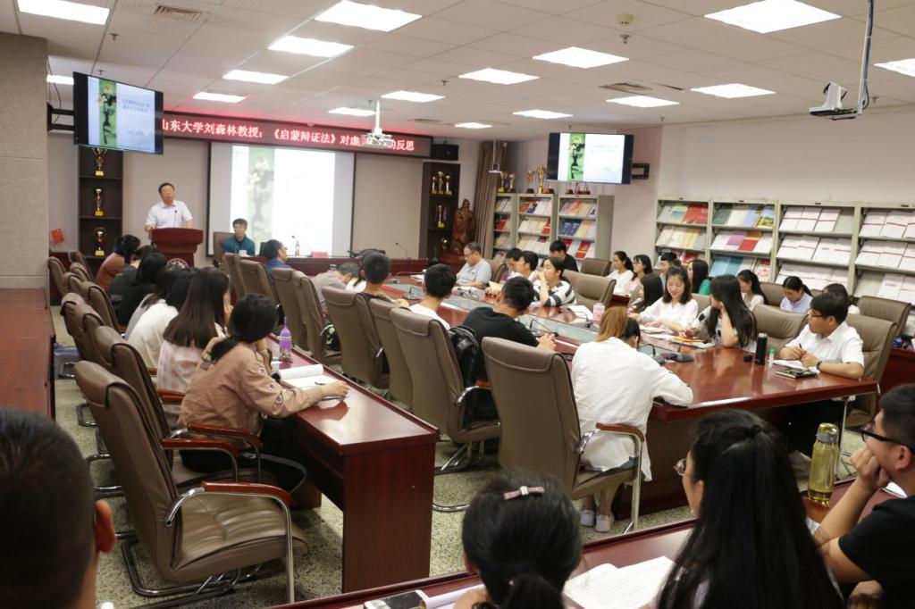 大会伊始,刘森林教授针对近期所在研究做了简要介绍,随后他分别从价值虚无主义的严峻性、价值虚无主义的中国性、《启蒙辩证法》对现代价值虚无主义的思考所做的推进这三个方面解释为何要以此为题。其次,刘森林教授从以尼采的“上帝之死”为通常的含义和马克思的规定资本的逻辑使然两个方面简述价值虚无主义的概念和争议;第三,针对《启蒙辩证法》是怎样论证虚无主义从崇高价值到基本价值进行讨论;第四,介绍从苏格拉底到荷马的虚无主义起源;第六,刘森林教授以陀思妥耶夫斯基为例,阐述信仰对知识的依赖是理性主义文化的必然结果;第七,他强调艺术的科学化、技术化进一步加剧了虚无主义。同时,刘森林教授表示,从某种意义上说,《启蒙辩证法》的虚无主义思考整合了马克思、尼采和陀思妥耶夫斯基、屠格涅夫的相关思想,具有更大的视野。在现场互动环节,刘森林教授详细解答了现场老师及同学们的疑问。报告历时2个小时,学术氛围浓厚,精彩至极,赢得了在场师生们的阵阵掌声,同学们纷纷表示获益匪浅。