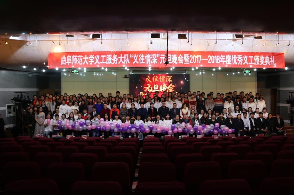 12月23日,曲阜师范大学义工服务大队“义往情深”元旦晚会暨2017―2018年度义工颁奖典礼于图书馆报告厅举行,日照市林海社区党委书记孙玫,日照市山海天消防大队负责人刘盈志,日照市义务工作者联合会会长刘超,日照市义务工作者联合会管理员薛东如、陈赛萍、郑秀芝,日照市陈疃镇中心小学教师张霞,日照市结核所大夫上官士超,马克思主义学部党委副书记宋钧文,团委书记陈敏,教师耿春亮应邀出席,2017级全体同学积极参加。