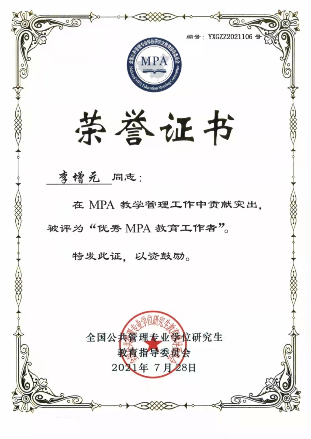 林士俊副教授荣获“优秀MPA教师”荣誉称号,李增元教授荣获“优秀MPA教育工作者”荣誉称号。本次获奖,是对两位教师教学水平和工作能力的高度认可,两位教师多年来致力于MPA教育工作,全面贯彻党的教育方针,落实立德树人根本任务,在MPA教学管理中积极探索MPA教育理念和发展特点,为欧冠直播app