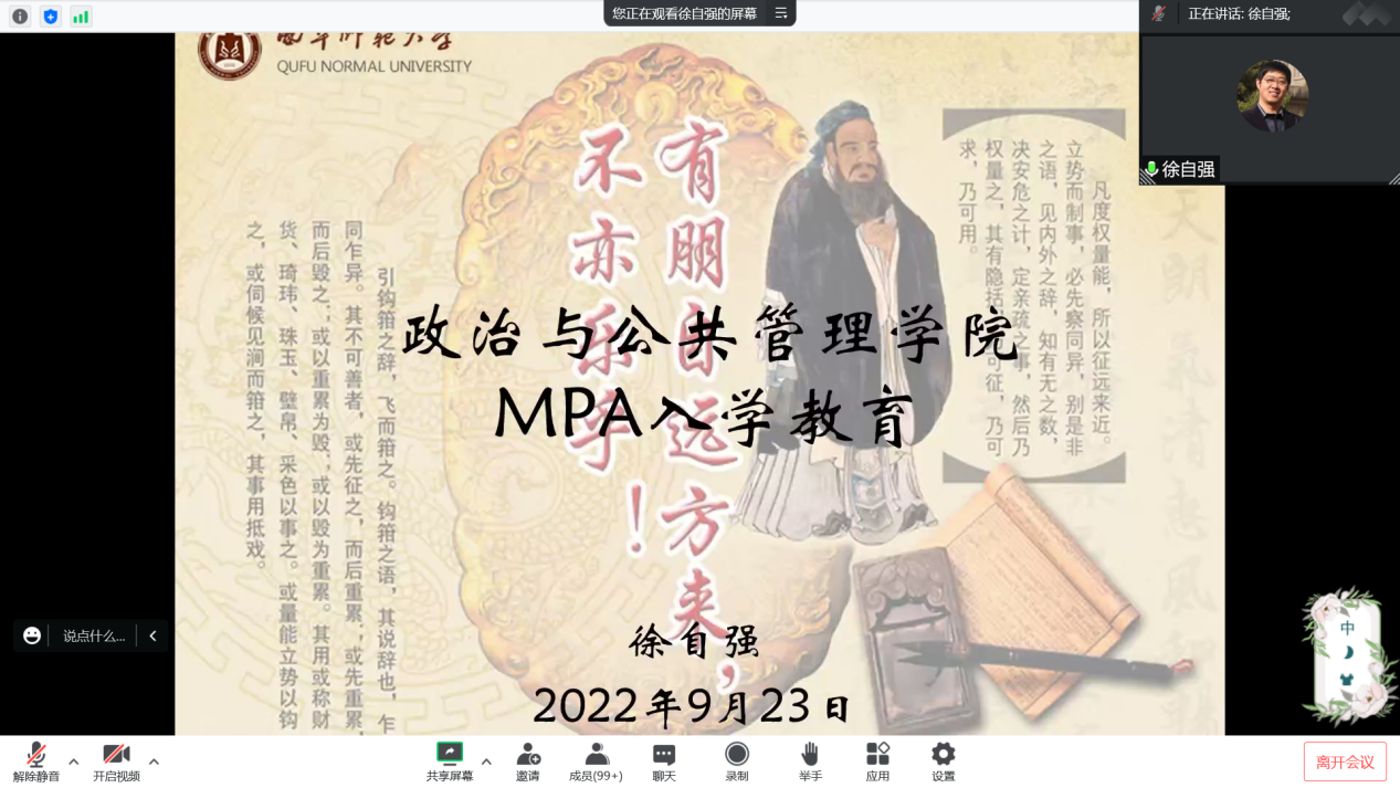 程香丽老师就MPA研究生的教学工作进行介绍,针对研究生期间的课程类别、课程安排、课程考勤、上课纪律等内容进行介绍,希望全体研究生能够自觉遵守,严于律己。