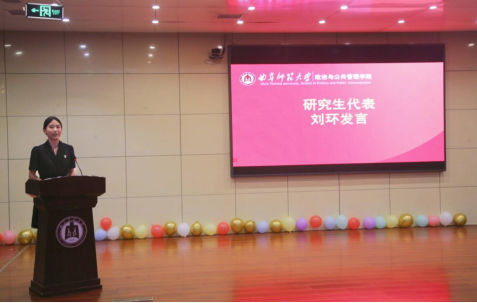 研究生刘环代表全体毕业生发言,向在座的老师们和同学们表达感谢与不舍,并回顾自己的学习生涯,她表示在未来的道路上自己心中仍会铭记政院老师们对自己的谆谆教导,用行动践行为政致公、弘道致远的院训。