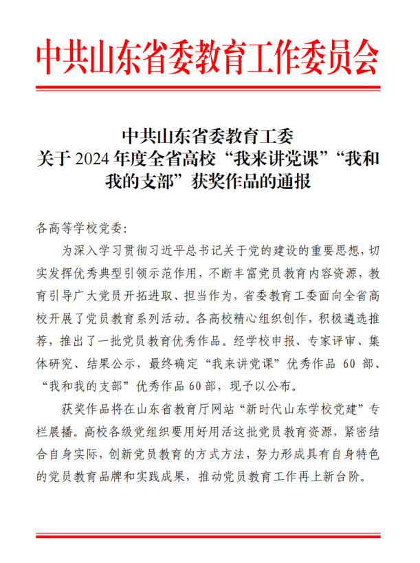 日前,中共山东省委教育工委正式公布了关于2024年度全省高校“我来讲党课”“我和我的支部”的获奖作品,欧冠直播app